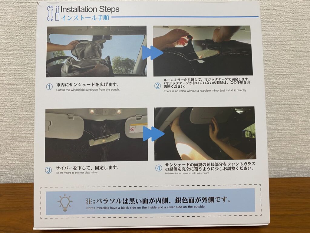 取扱説明については4ステップで書いてくれていますが、サンシェードを広げるというのは当たり前のことなので、実質は3ステップとなります。