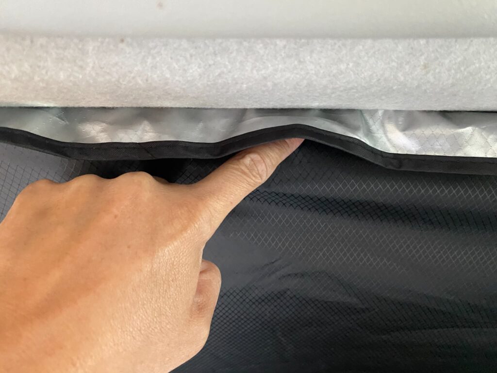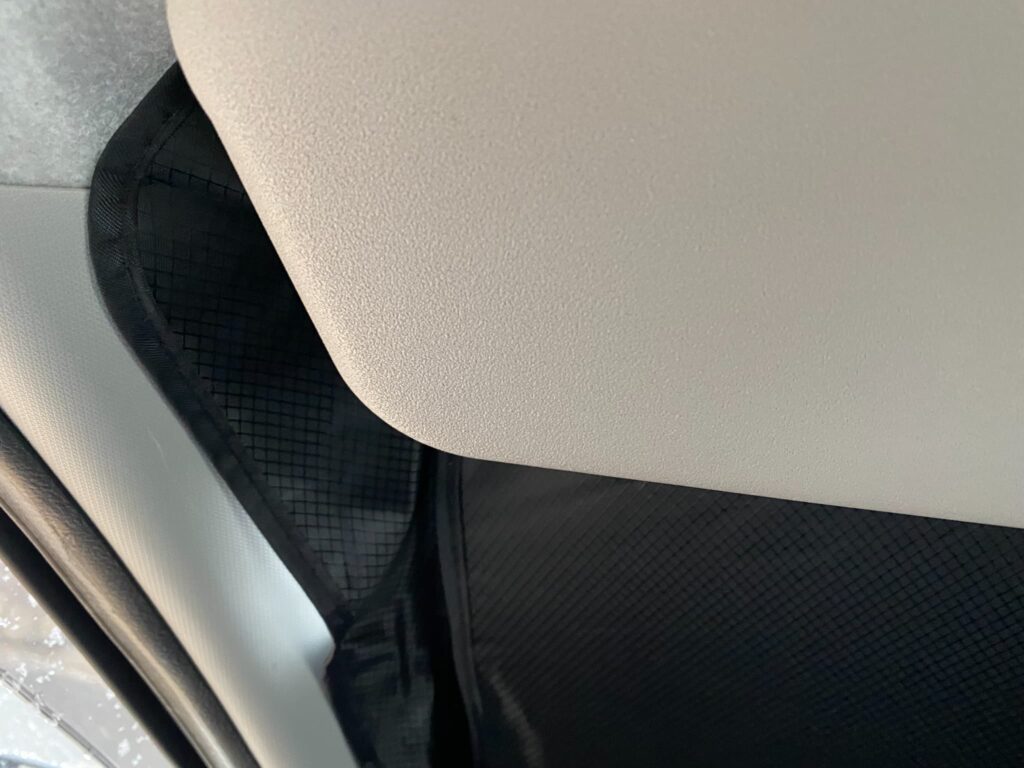 各コーナーはこのように少し長めにサンシェードが伸びていますので、光が入り込まないように最終的には微調整していくといった感じになります。サンシェードの下部も同じことが言えます。周囲をきちんと綺麗に整えることで光が漏れて入ってくることはありません。