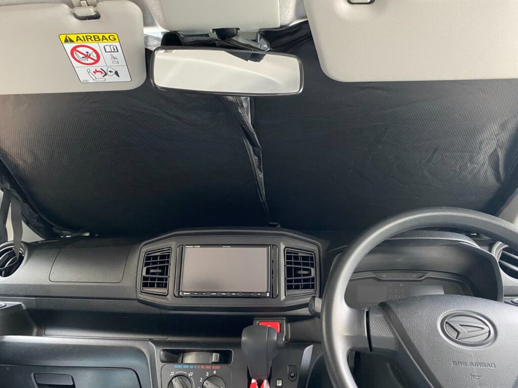 両サイドのサンバイザーできちんとホールドして、あとは光が入り込みやすい四隅やルームミラーのところを調整してあげれば取り付け完了です。